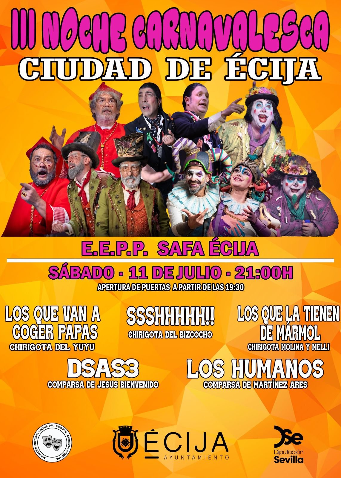 Jul 11 III Noche Carnavalesca en Écija 21:00 - 23:59 EEPP SAFA Écija Av. Dr. Sánchez Malo, 75, Écija Detalles de Evento Cómo llegar