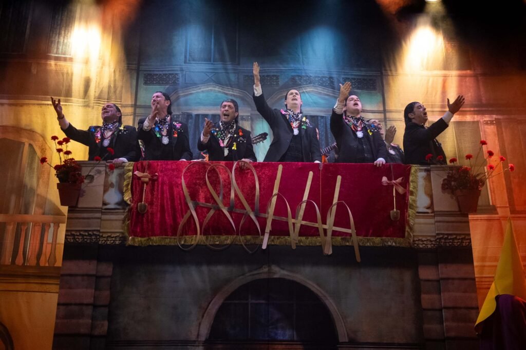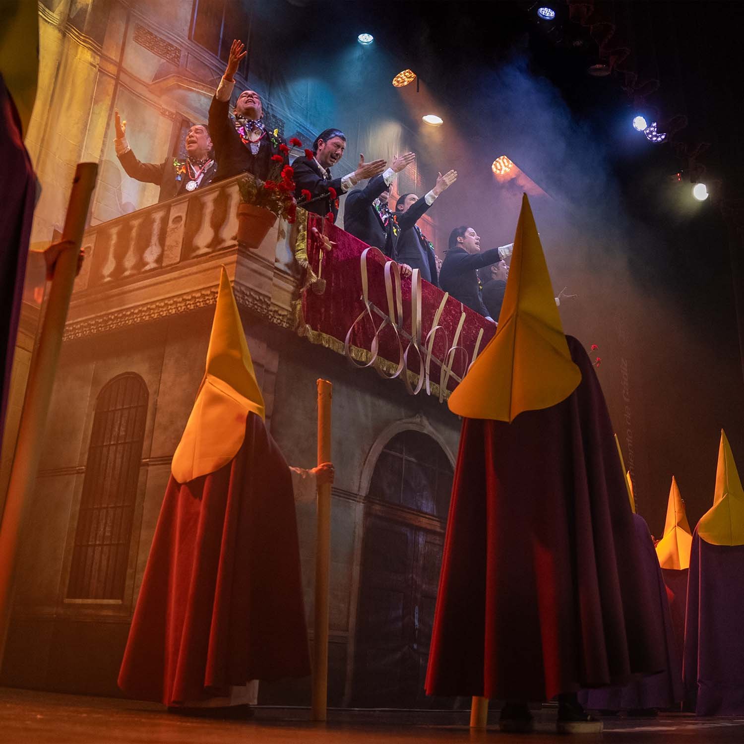 Bajo un nombre que hacía muy difícil adivinar la temática, la chirigota del Bizcocho apareció caracterizada como saeteros desde un balcón, penitentes que entran y salen de escena como si el Falla se transformara por momentos en una auténtica procesión. La puesta en escena es sencillamente maravillosa. Cantan su saeta, se recogen y vuelven a salir, construyendo un juego escénico que mantiene al público enganchado desde el primer segundo. La entonación es impecable y la saeta, interpretada con mucha verdad, termina de meter al teatro en la propuesta.